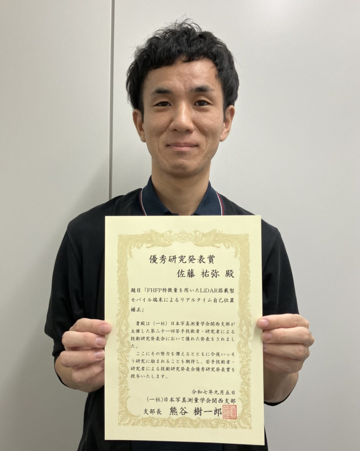 2025年9月5日に開催された「第21回若手技術者・研究者による技術研究発表会」(主催:一般社団法人日本写真測量学会関西支部)で、当社先端技術研究所の佐藤祐弥が優秀研究発表賞を受賞しました。今回受賞した論文「FPFH特徴量を用いたLiDAR搭載型モバイル端末によるリアルタイム自己位置補正」はロケーションベースARにおいて自己位置や姿勢の誤差を低減する手法に関する研究成果となります。今回、研究発表会にて優れた発表をしたことから優秀研究発表賞が授与されました。