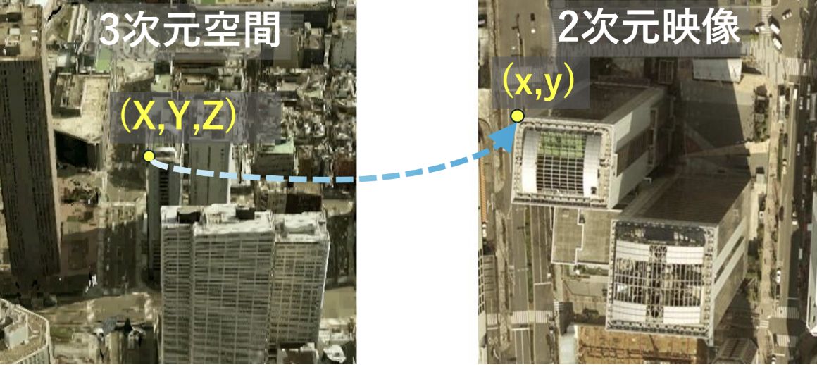 3次元空間をある視点から映した瞬間的な映像の中では、3次元空間内の位置が決まっていれば、それが映る映像内の位置が決まる(投影)。