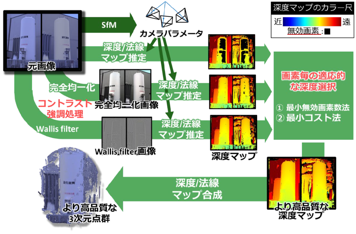 本研究では、この課題に対応するため、SfM-MVSにおける深度マップおよび法線マップの推定過程に着目しました。具体的には、元画像とはコントラスト特性の異なる複数の強調画像群を生成し、それぞれから取得された深度マップおよび法線マップの中から、画素ごとに最も信頼性の高い情報を適応的に選択する手法を新たに提案しました。この方法により、深度・法線情報の局所的な不安定性を抑え、低テクスチャ領域でも高品質なマップの生成が可能となります。