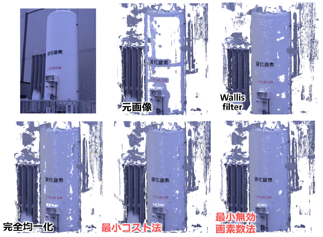 また、提案手法の有効性を検証した結果、従来のコントラスト強調法であるWallisフィルタが適用困難であった高テクスチャ領域においても、安定して十分な再構成点数を確保できることを確認しました。さらに、異なるコントラスト処理の有無や手法間で再構成可能範囲に差が生じた場合でも、それぞれの深度・法線情報を相互に補完することで、再構成領域を拡大できることを実証しました。