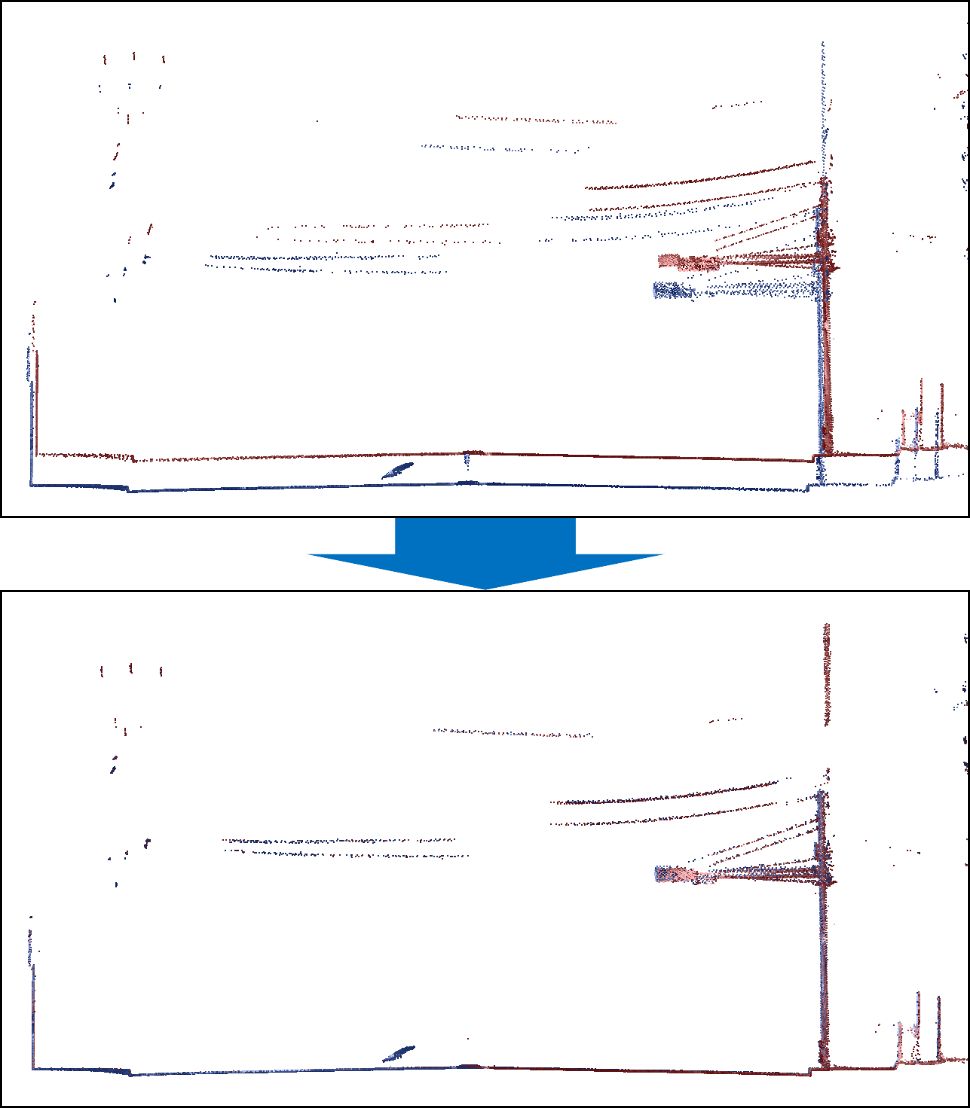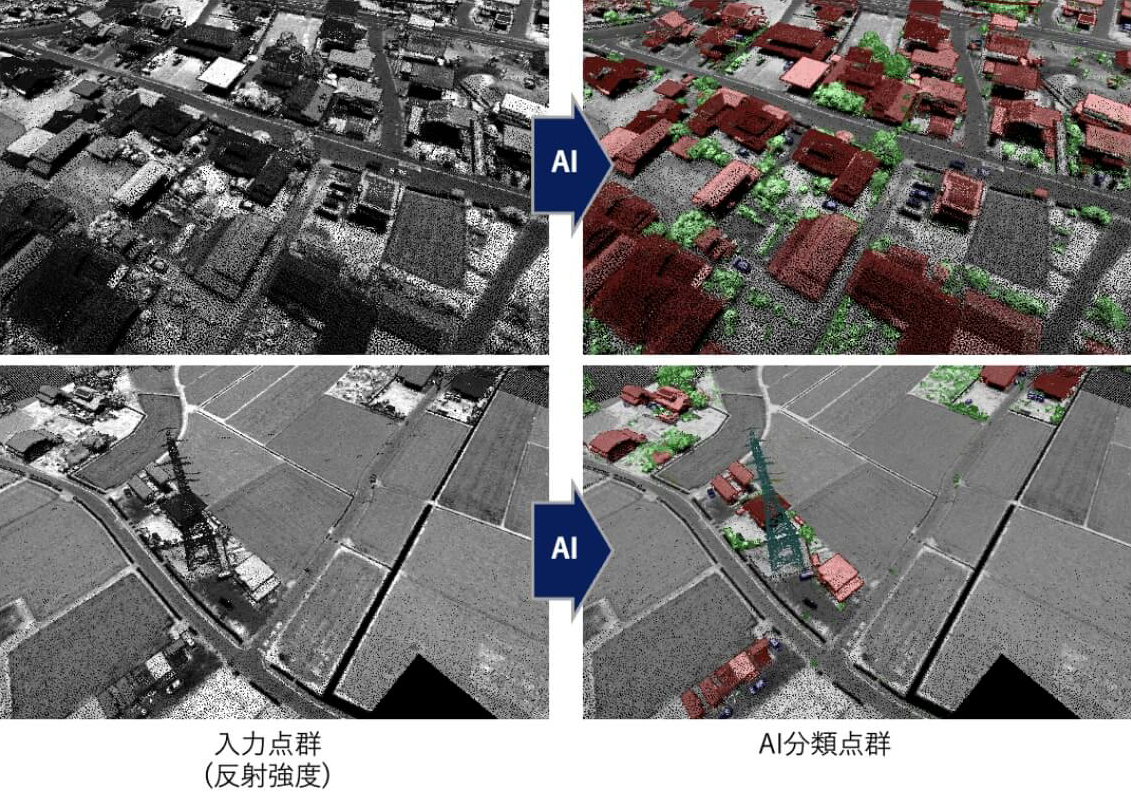 先端技術研究所では、AI技術を活用し、様々な方法で取得された点群に対し、ノイズフィルタリングや自動分類、地物認識、3次元図化の自動化・高度化に向けた開発に取り組んでいます。